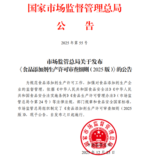 市场监管总局发布《食品添加剂生产许可审查细则(2025版)》