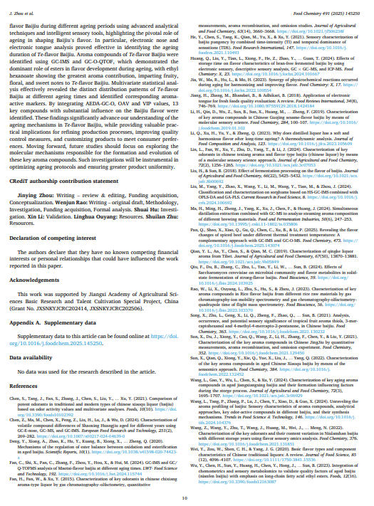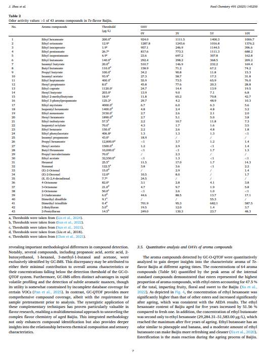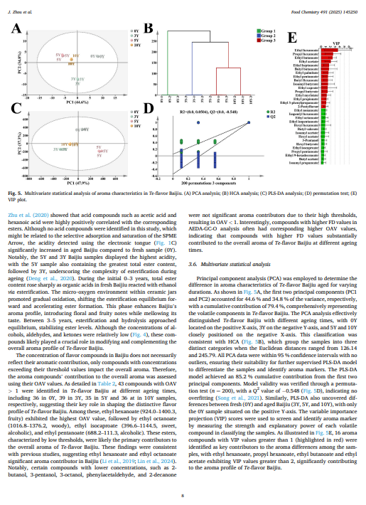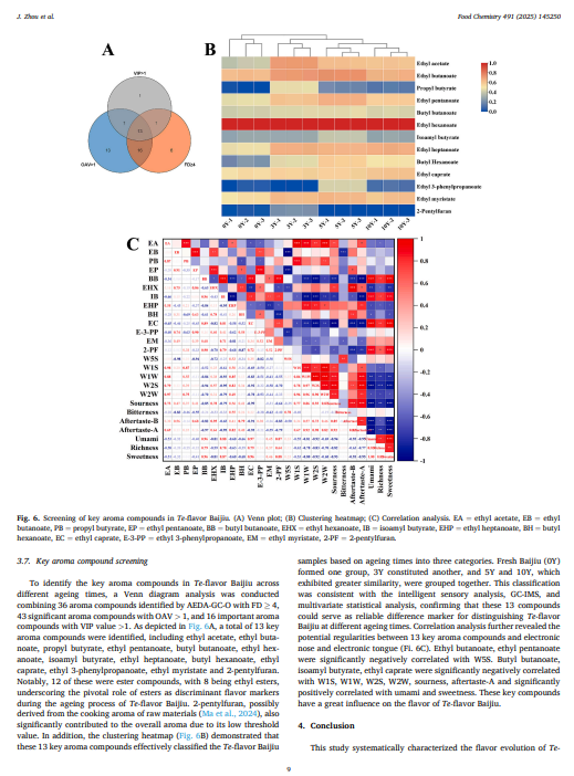 特风味白酒以其复杂的感官特性而闻名,其在陈酿过程中会经历显著的变化,但驱动这些变化的香气活性化合物尚未得到充分研究。为了系统地评估陈酿时长对其风味特性的影响,本研究对陈酿 0.3 年、5 年和 10 年的样品进行了对比分析。结果表明,酯类物质在陈酿过程中对风味发展起着主导作用。在最初的陈酿阶段,酯类物质的浓度显著增加,其中乙基己酸酯因其高浓度和显著的气味贡献而成为关键化合物。值得注意的是,不同陈酿阶段的香气和味道存在明显差异,新鲜的特风味白酒(0Y)具有更高的甜度。多变量统计分析揭示了不同陈酿阶段的香气特征,并确定了 13 种关键的香气化合物,形成了特风味白酒独特的风味骨架。本研究阐明了特风味白酒在陈酿过程中的风味演变动态,为白酒生产的工艺改进和质量控制提供了基础见解。