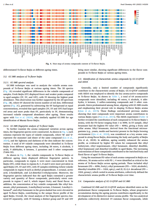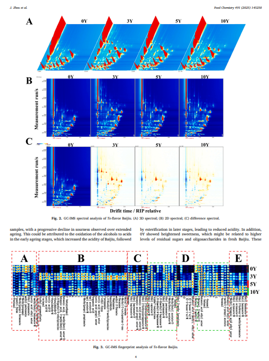 利用气相色谱 - 离子迁移谱、气相色谱 - 有序质量飞行时间质谱以及电子感官技术揭示中国特香白酒在陈酿过程中的香气演变情况