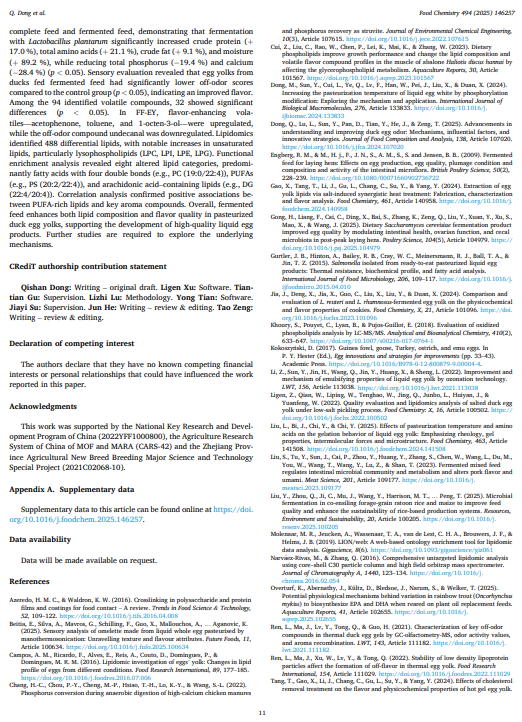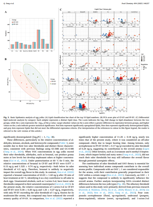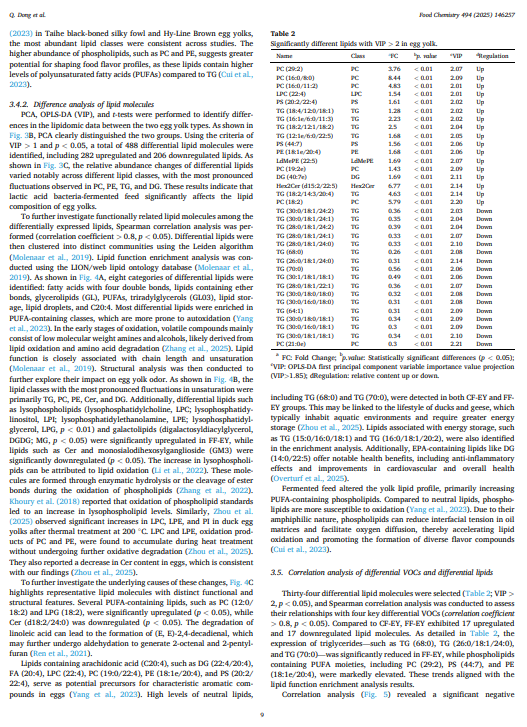 本研究采用综合二维气相色谱 - 飞行时间质谱法和脂质组学技术,探究了发酵饲料对巴氏杀菌鸭蛋蛋黄中脂质组成和挥发性风味化合物的影响。研究结果表明,与对照组相比,发酵饲料显著降低了蛋黄的异味强度(通过感官评估证实)。共鉴定出 94 种挥发性化合物,其中 32 种在两组之间存在显著差异(p < 0.05)。关键的挥发性化合物(苯乙酮、甲苯和 1-辛烯-3-醇)水平升高,而十一烷醇水平降低。这四种关键化合物与风味变化密切相关。脂质组学富集分析揭示了八个显著改变的脂质类别,包括富含多不饱和脂肪酸的脂质水平升高,如三酰甘油(18:2/14:3/20:4)、磷脂酰乙醇胺(18:1e/20:4)和软脂酰磷脂胆碱(22:4),这些脂质与令人愉悦的香气化合物呈正相关。这些发现为提高巴氏杀菌鸭蛋产品的风味质量和开发高品质液态鸭蛋产品提供了理论基础。