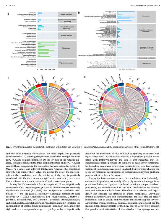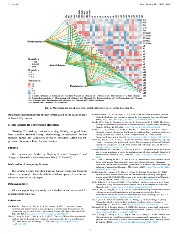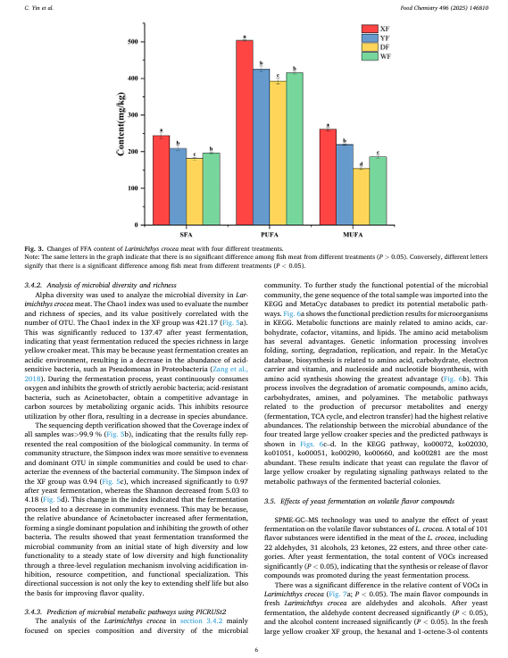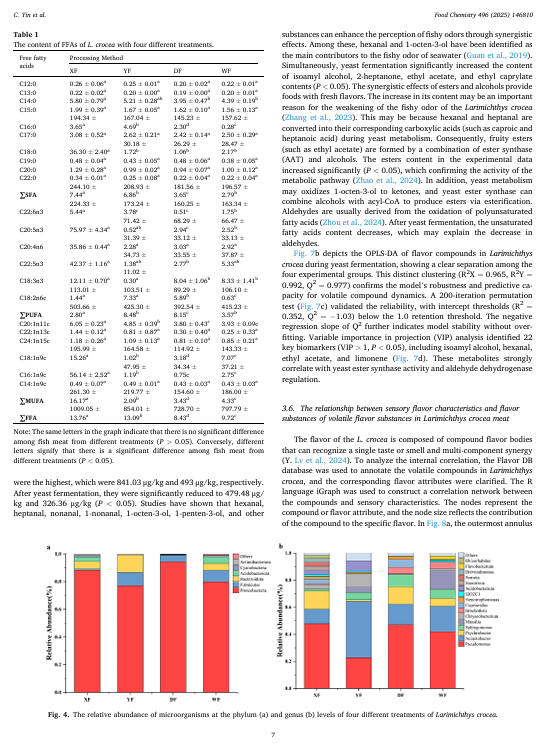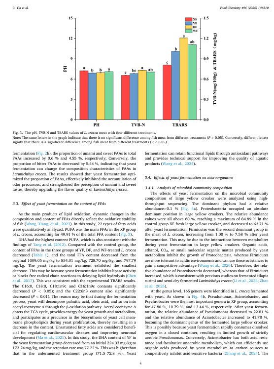 为了研究大黄鱼高效的除臭策略,本研究采用了高活性干酵母进行除臭处理。通过物理化学指标、高通量测序和风味组学分析,评估了品质变化、鱼腥味代谢途径以及风味重建情况。结果表明,酵母发酵显著降低了系统的 pH 值,并抑制了总挥发性碱氮。总脂肪酸和长链脂肪酸显著减少(p < 0.05),鲜味和甜味脂肪酸在总脂肪酸中的比例增加,而苦味脂肪酸的比例降低了 5.44%。微生物分析显示,在大黄鱼发酵前,主要菌群为假单胞菌和不动杆菌。酵母发酵后,假单胞菌受到显著抑制,不动杆菌成为优势菌群,具有改善风味的潜力。风味组学分析表明,与物理除臭相比,与鱼腥味相关的苯甲醛、己醛和 1-辛烯-3-醇的含量显著降低,而具有愉悦发酵风味的醇类和酯类的含量显著增加。这种处理方式容易破坏食材的口感,并且化学除臭还会留下残留物。而本研究既安全又高效。它从微生物 - 代谢产物 - 气味挥发物相互作用的角度揭示了酵母发酵的除臭转化途径,为鱼类产品风味的定向调控及其工业应用提供了理论基础和技术支持。