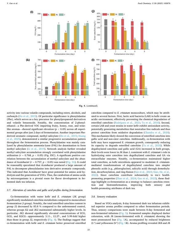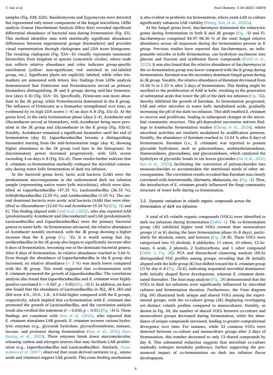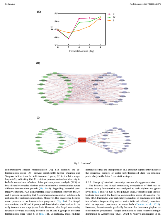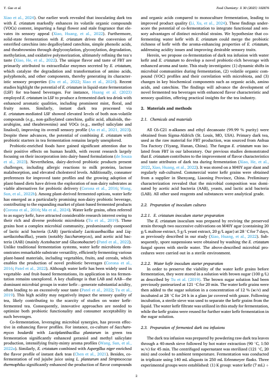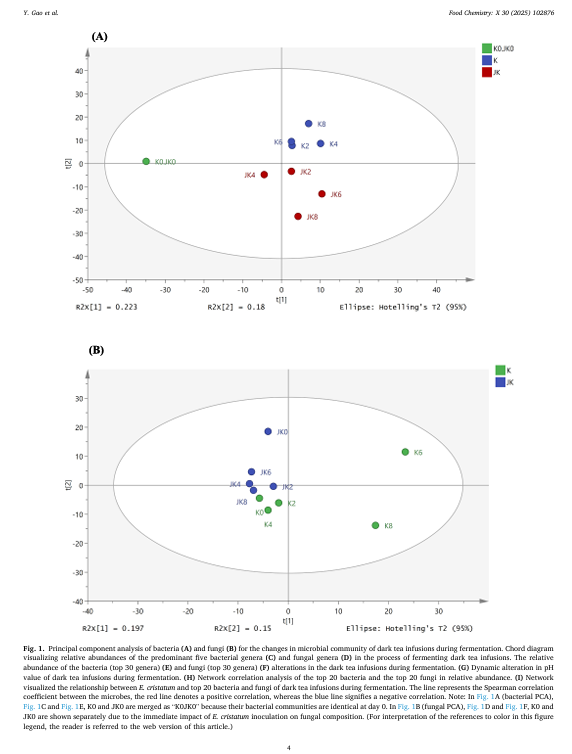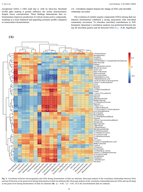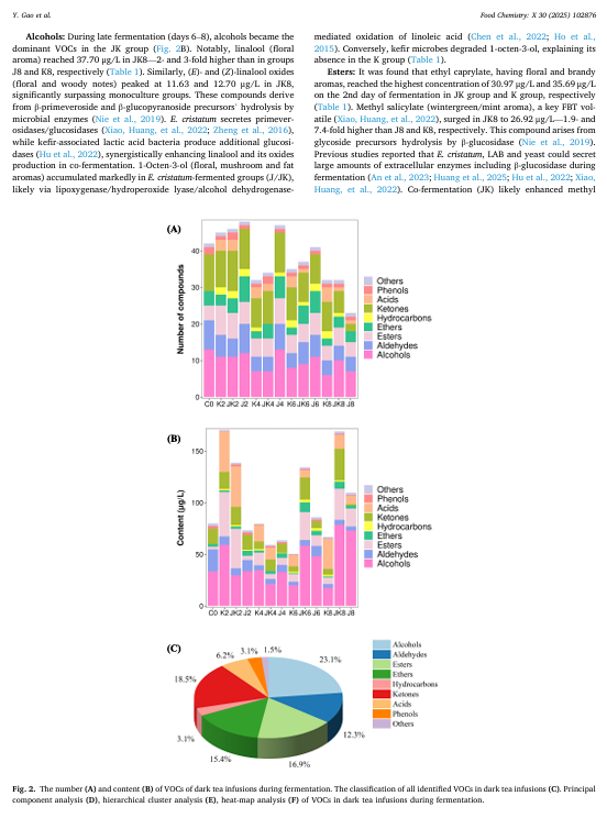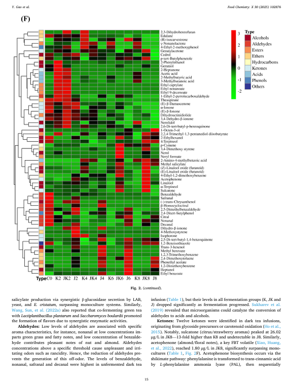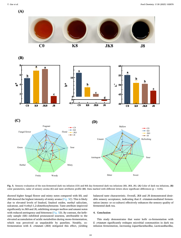 水格里菲斯菌(一种富含益生菌的培养物)和欧特米乌斯·克里斯塔特菌(福砖茶中的关键真菌)与黑茶浸液一起发酵,以研究挥发性有机化合物(VOCs)、微生物群落和生化成分的动态变化。共同发酵极大地改变了微生物组成,丰富了有益的乳酸菌(如酒乳酸杆菌、乳酸伊巴克菌),同时抑制了不良微生物(如酵母菌)。共发酵共鉴定出 65 种挥发性有机化合物,其中共发酵促进了花香、果香、薄荷香和陈腐香气(如芳樟醇、甲基水杨酸酯、苯乙酮),同时减少了异味(如 3-甲基丁酸)。多变量分析揭示了核心功能微生物群(如葡萄糖杆菌、乙酸杆菌、欧特米乌斯等)与风味形成密切相关。此外,共发酵调节了有机酸、游离氨基酸和儿茶素,改善了感官特性。感官评估证实了卓越的香气复杂性(增强了薄荷/花香的风味)和均衡的口感(减少了酸味/苦味/涩味特征)。这些研究结果表明,水克尔菌和 E. cristatum 的协同发酵能够显著改善黑茶的风味特征,为大规模工业化的益生菌茶饮料开发提供了一种极具前景的策略。