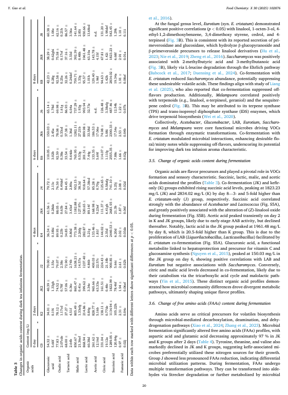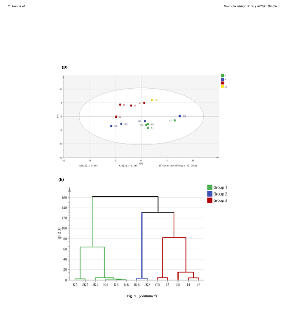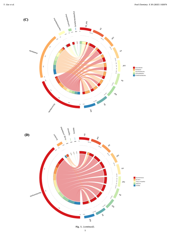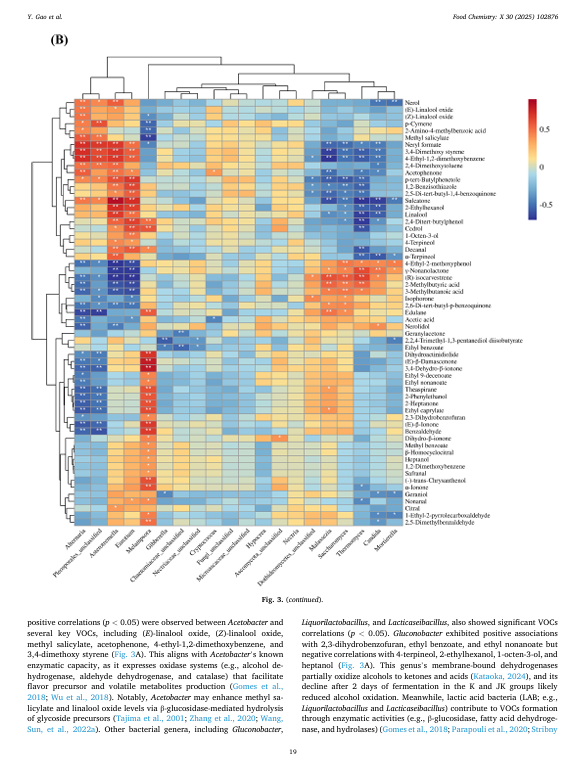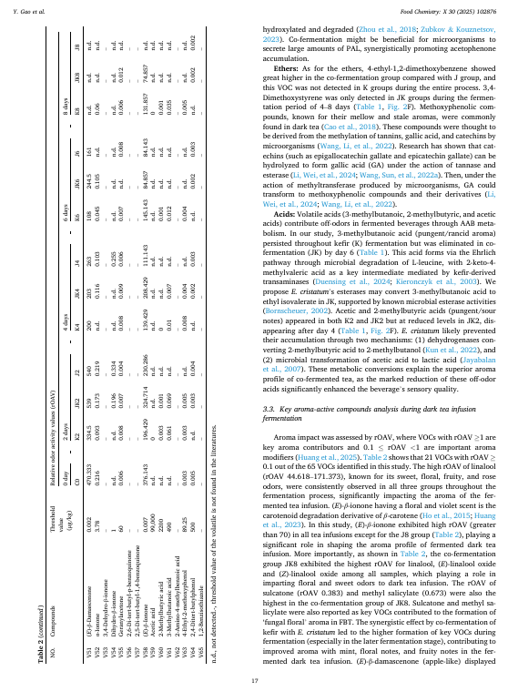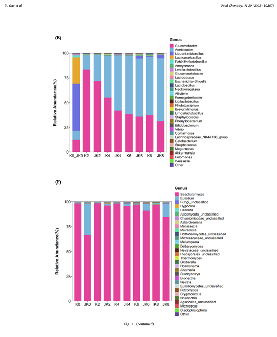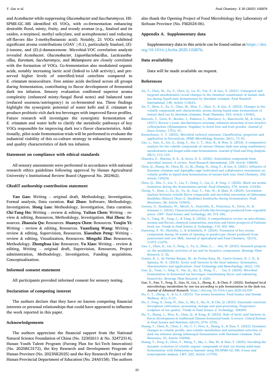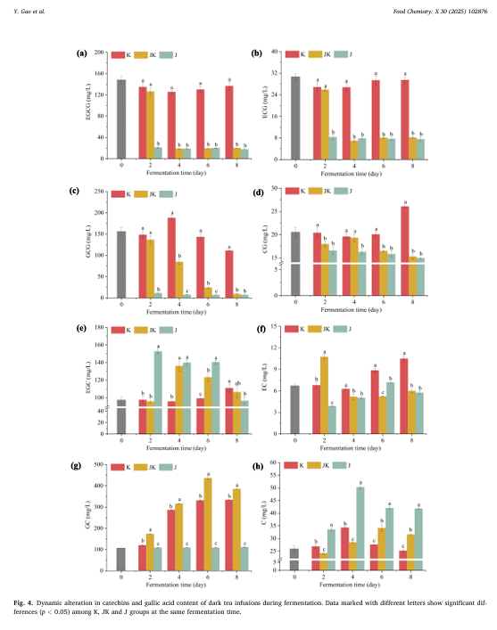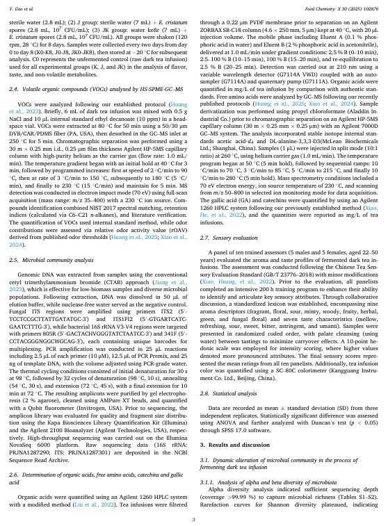 水格里菲斯菌(一种富含益生菌的培养物)和欧特米乌斯·克里斯塔特菌(福砖茶中的关键真菌)与黑茶浸液一起发酵,以研究挥发性有机化合物(VOCs)、微生物群落和生化成分的动态变化。共同发酵极大地改变了微生物组成,丰富了有益的乳酸菌(如酒乳酸杆菌、乳酸伊巴克菌),同时抑制了不良微生物(如酵母菌)。共发酵共鉴定出 65 种挥发性有机化合物,其中共发酵促进了花香、果香、薄荷香和陈腐香气(如芳樟醇、甲基水杨酸酯、苯乙酮),同时减少了异味(如 3-甲基丁酸)。多变量分析揭示了核心功能微生物群(如葡萄糖杆菌、乙酸杆菌、欧特米乌斯等)与风味形成密切相关。此外,共发酵调节了有机酸、游离氨基酸和儿茶素,改善了感官特性。感官评估证实了卓越的香气复杂性(增强了薄荷/花香的风味)和均衡的口感(减少了酸味/苦味/涩味特征)。这些研究结果表明,水克尔菌和 E. cristatum 的协同发酵能够显著改善黑茶的风味特征,为大规模工业化的益生菌茶饮料开发提供了一种极具前景的策略。