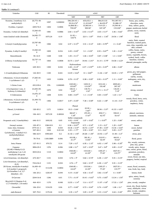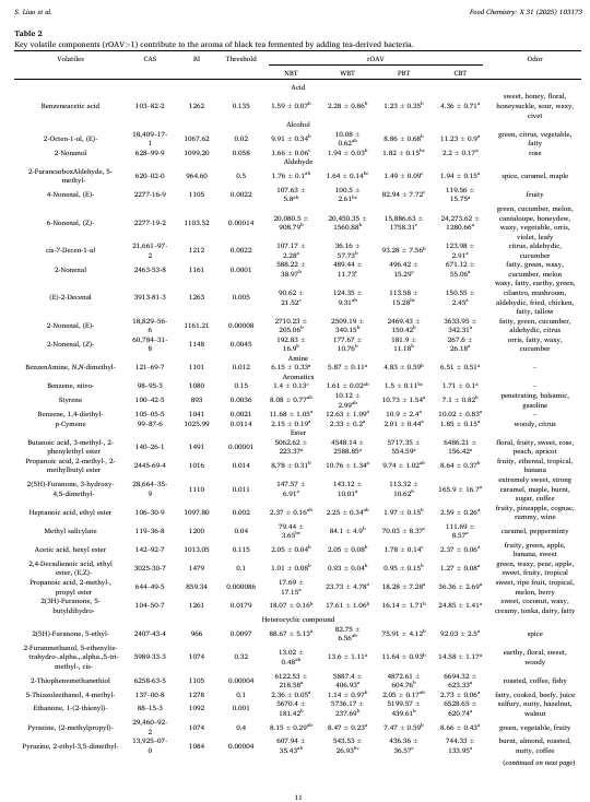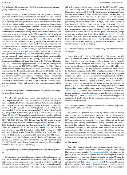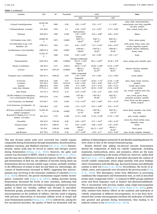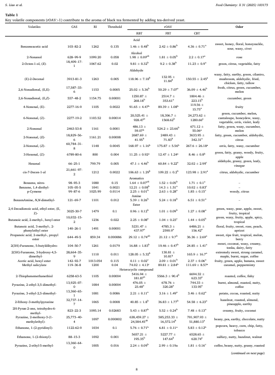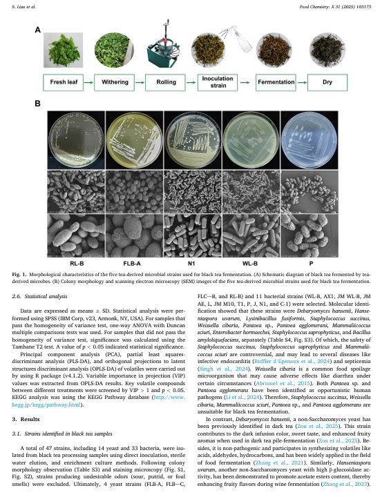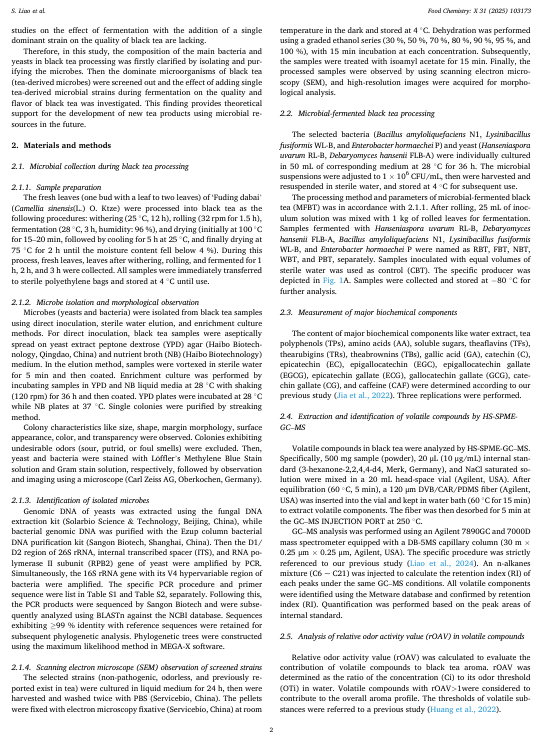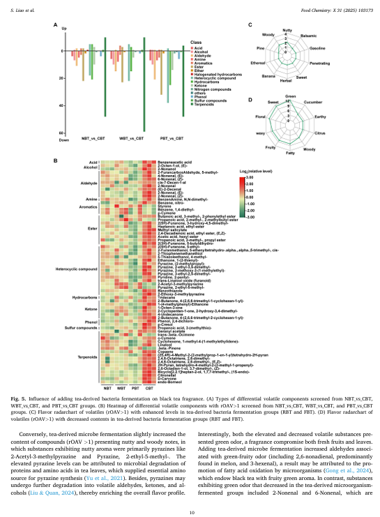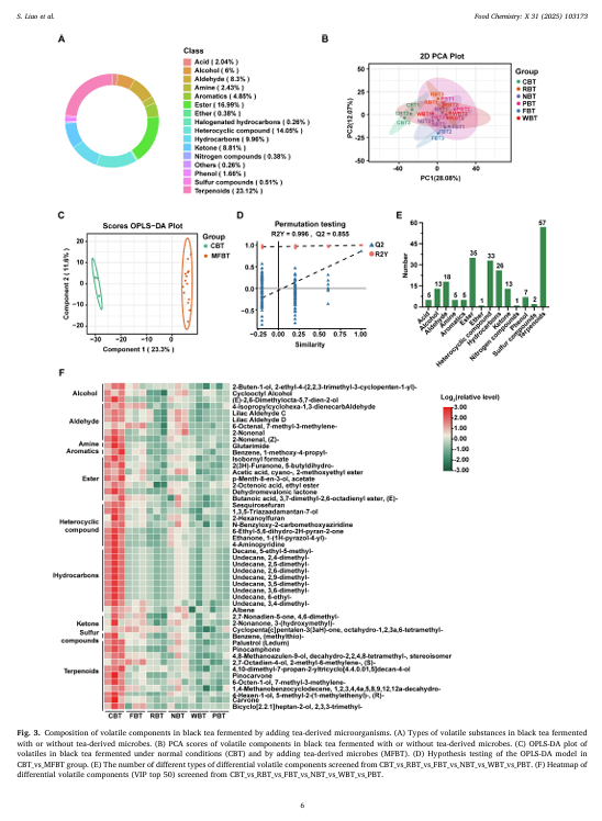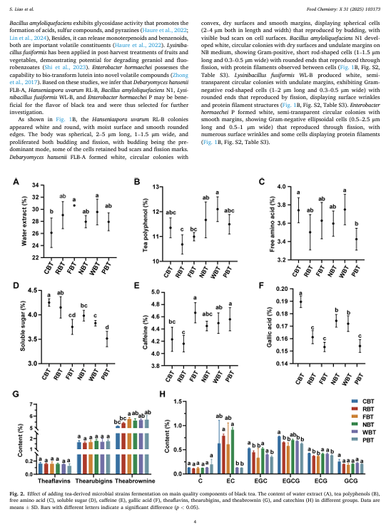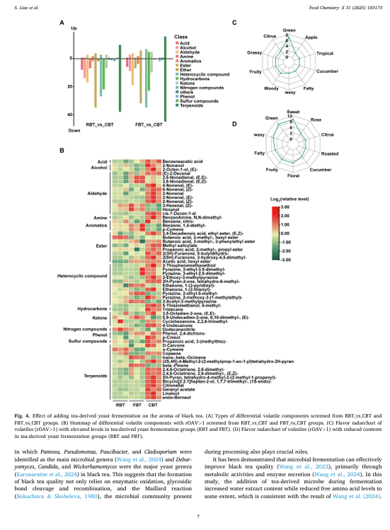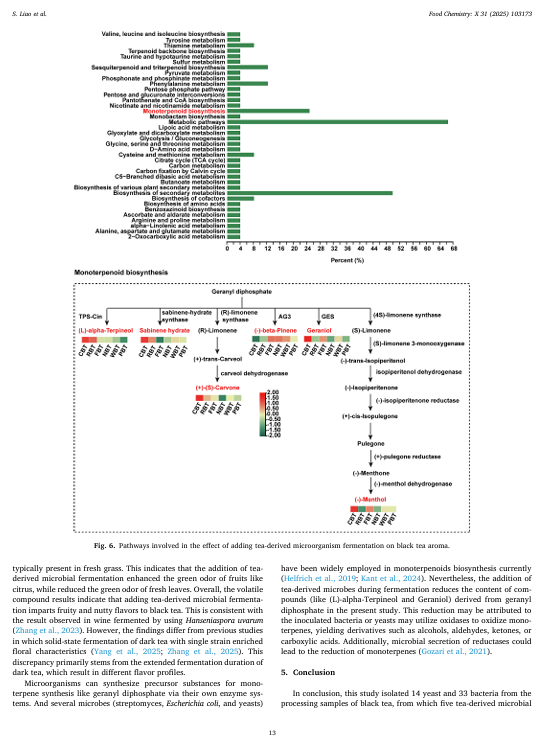 本研究中,从红茶加工样本中分离出的微生物被添加到红茶发酵过程中,并对添加单一茶源微生物发酵的红茶的挥发性成分和化学特性进行了研究。简而言之,共分离出 14 株酵母和 33 株细菌,其中 5 株被选用于红茶发酵。在发酵过程中添加茶源微生物增加了红茶中水提取物、咖啡因和茶褐素的含量,同时降低了可溶性糖、没食子酸和酯型儿茶素的含量,其中汉逊酵母 RL-B 和枯草芽孢杆菌 Nl 发酵的红茶品质更佳。此外,茶源微生物发酵改变了挥发性化合物的组成,主要醇类、酯类、萜类和烃类的含量。它减少了具有甜味和花香风味的挥发性物质的含量,同时通过调节单萜生物合成途径增强了具有坚果味和果香的绿色香气物质的含量。这些发现为微生物影响红茶品质形成的机制提供了新的见解。