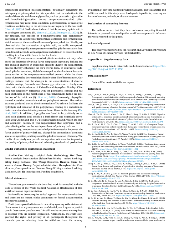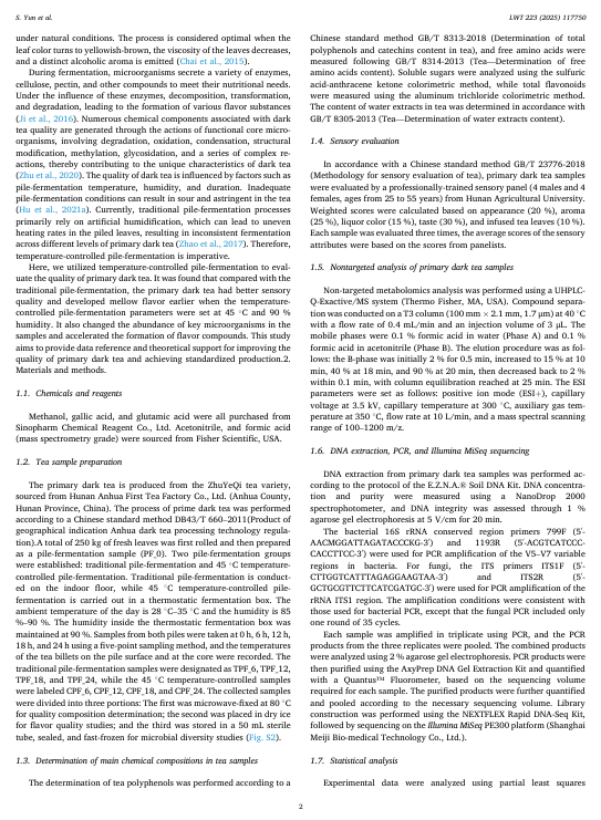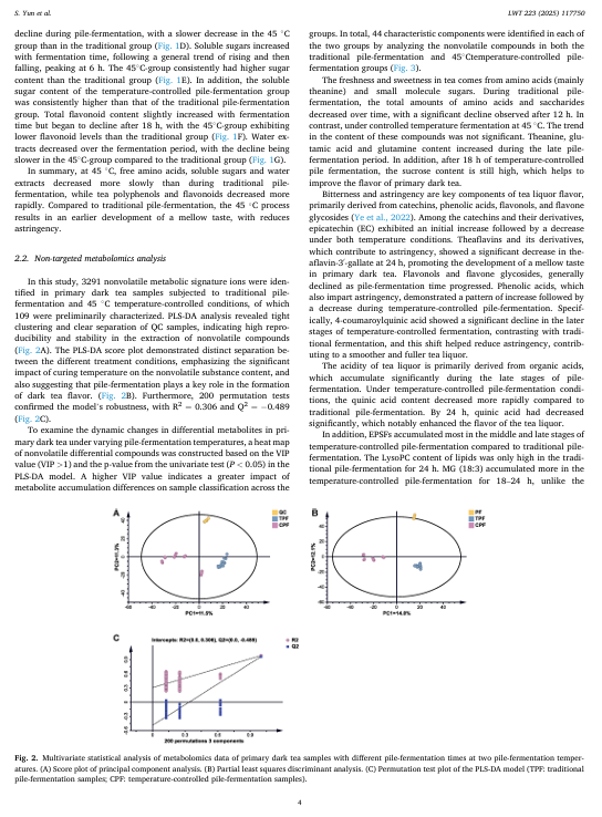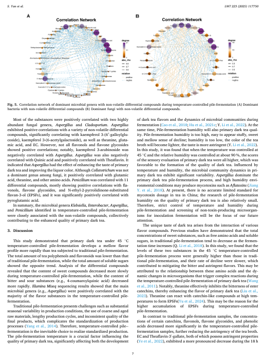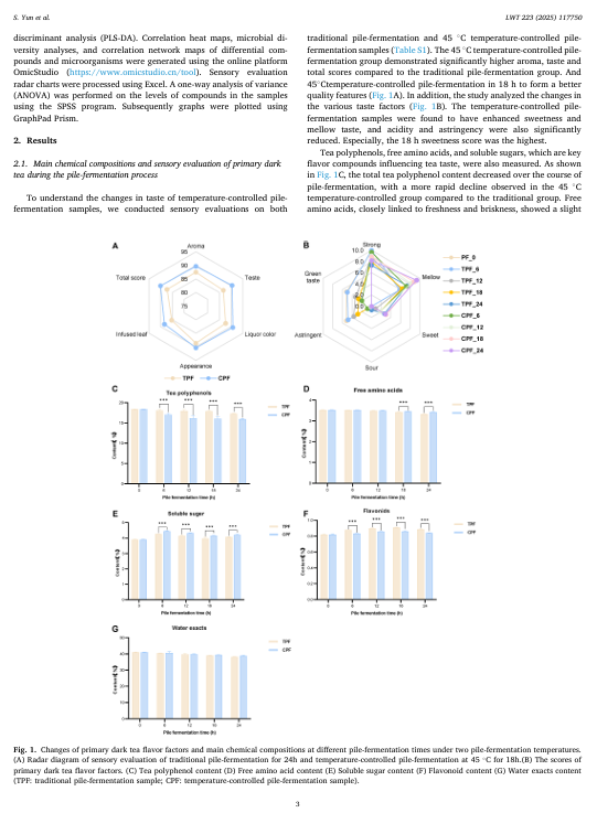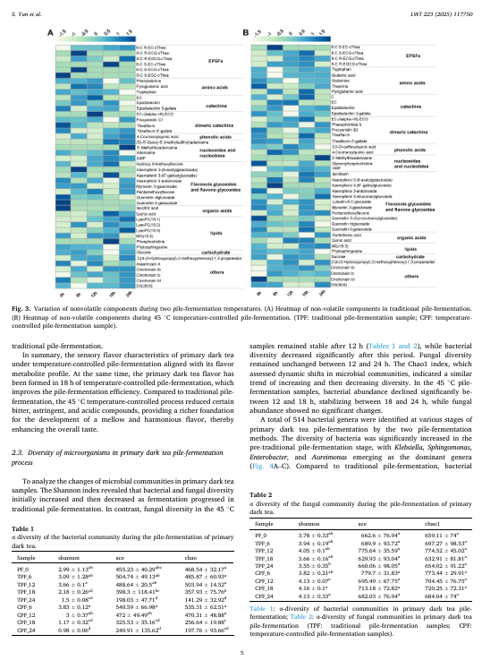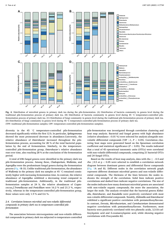 堆发酵的温度对黑茶的品质有着显著的影响。本研究将传统的黑茶堆发酵与在 45°C 下进行的温度控制堆发酵进行了比较,以提高其品质。采用感官评估、非靶向代谢组学和 Illumina MiSeq 测序等方法来评估其效果。结果表明,在 45°C 下进行的温度控制发酵具有更柔和的口感,并增强了整体风味,同时改变了关键微生物的丰度,并加速了风味化合物的形成。与传统的堆发酵相比,茶多酚和黄酮类物质的总量下降得更快,酚酸和有机酸则呈现下降趋势。特别是,在温度控制堆发酵的后期,4-对羟基苯甲酰奎宁酸的含量显著降低。多种因素共同作用改善了黑茶的风味。所鉴定的主要细菌属为克雷伯氏菌,而主要的真菌属包括卡洛索菌属、瓦勒米亚属和曲霉属。这些结果表明,采用温度控制的堆发酵工艺不仅能提升初制黑茶的品质,还能提高发酵过程的效率。