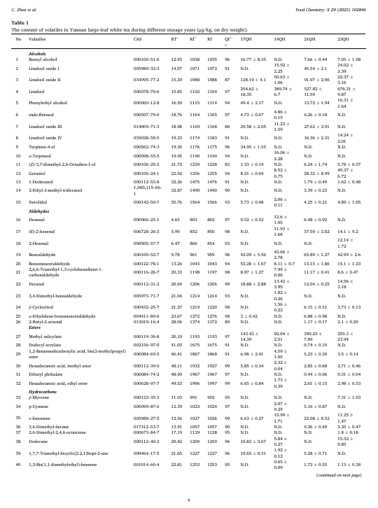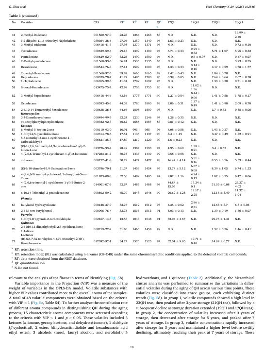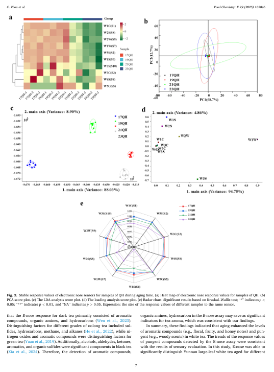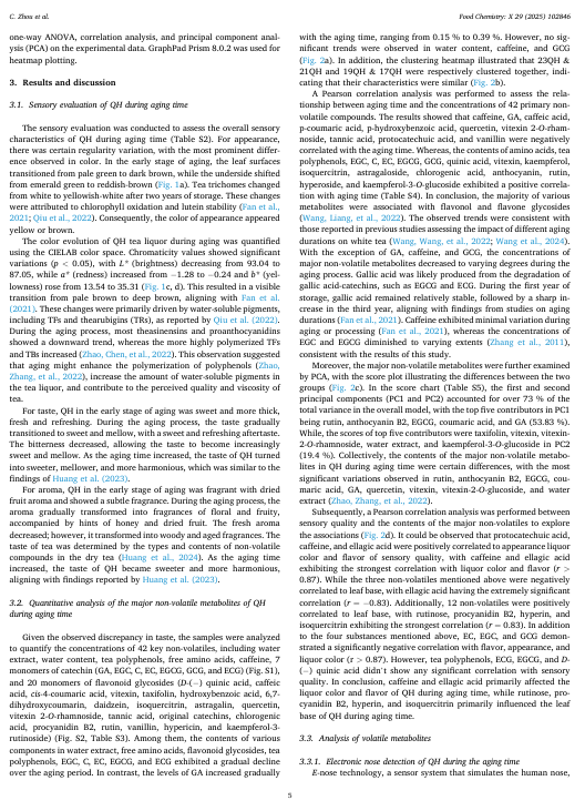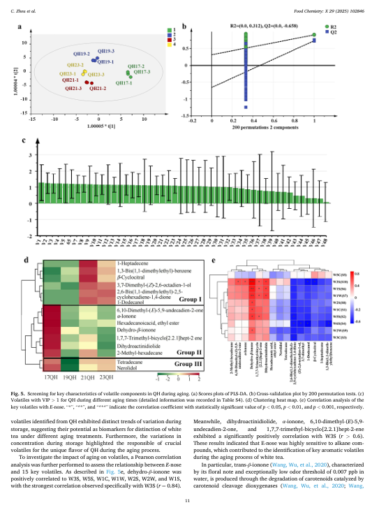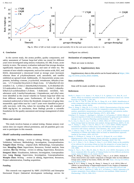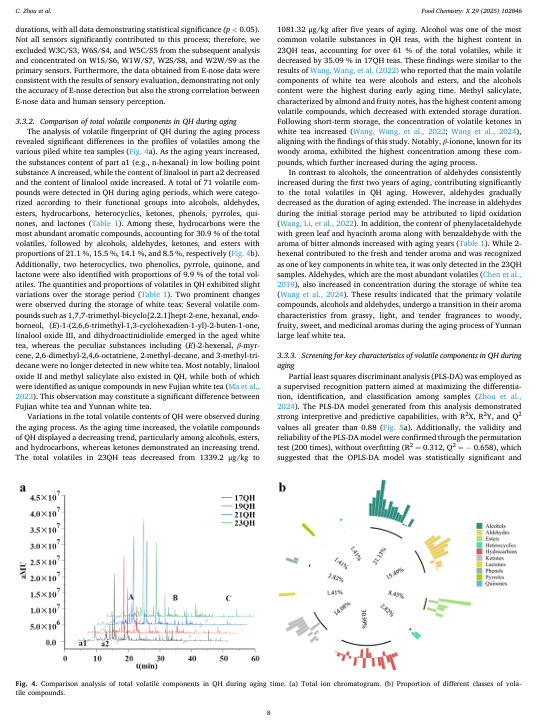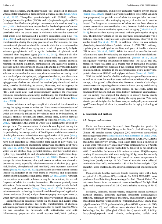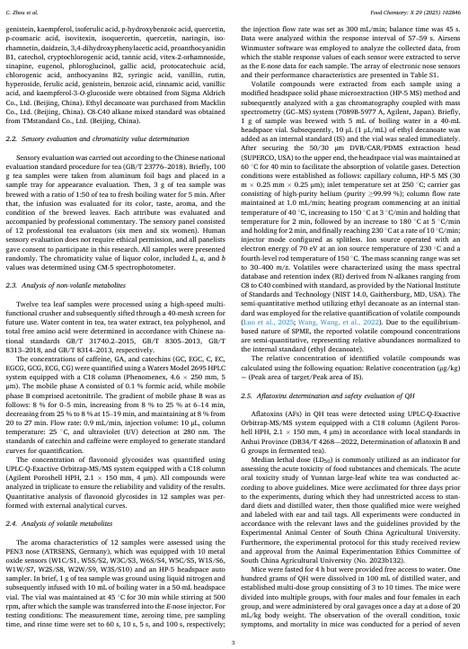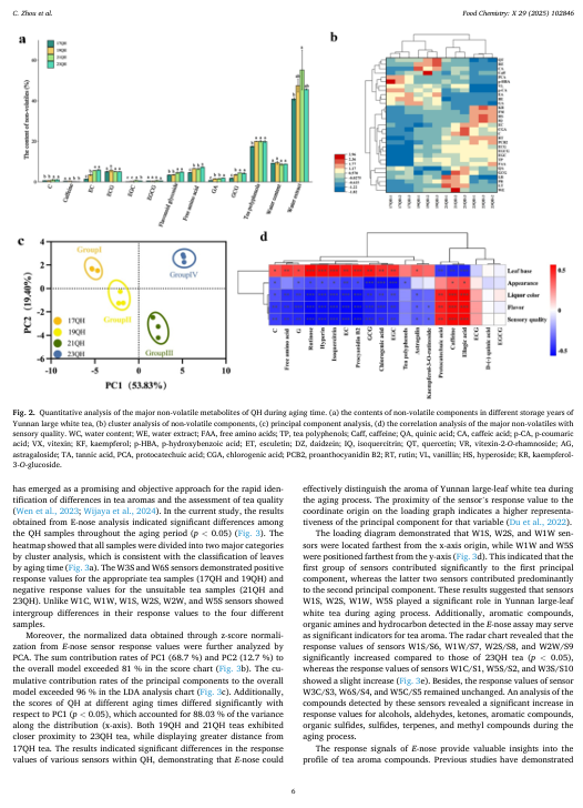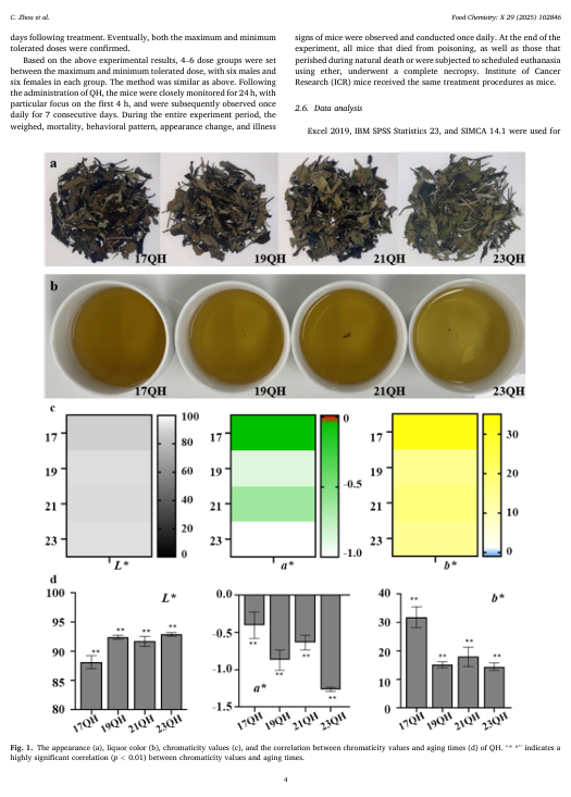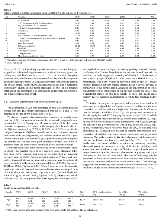 云南大叶白茶因其独特的风味而广受欢迎,这种风味源自当地的茶叶品种和生长环境。但关于其陈化过程如何显著提升其品质和风味这一问题仍不明确。在此研究中,对“清欢”(QH)茶在不同储存时间下的风味变化和安全性进行了分析,结果表明,随着时间的推移,老茶的风味变得更加甜美、顺滑且更加均衡,具有稳定且宜人的香气。总共筛选出了 32 种关键的非挥发性物质(如芦丁、(-)-表没食子儿茶素没食子酸酯、对香豆酸),并观察到挥发性物质(醇类、醛类、萜类)随时间的变化。此外,所有霉菌毒素在经过不同陈化时间后均未被检测到;2023 年和 2017 年的白茶口服半数致死剂量分别为 17.17 克/千克体重和 15.09 克/千克体重,这表明经过陈化时间的 QH 茶具有较高的饮用安全性。总体而言,QH 茶的风味和安全性随着储存时间的延长而提升,为收集白茶的时序价值提供了证据。