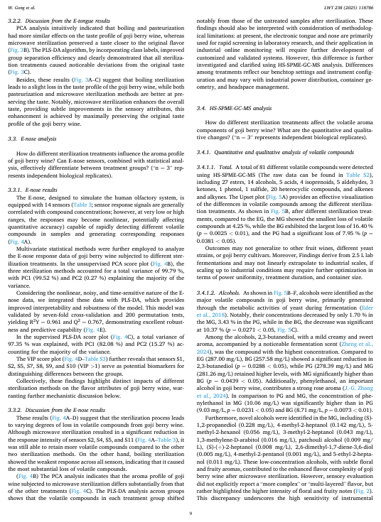 在饮料行业中,优化风味的保持能力对于品牌差异化和消费者忠诚度的持久维持至关重要。此外,独特的且稳定的风味能够塑造出独特的品牌标识,从而使其与竞争对手区分开来。目前,在酒精饮料风味保存方面,关于微波杀菌与传统方法的直接对比证据明显缺乏。在此,我们使用经过训练的感官小组、电子舌、电子鼻以及 HS-SPME-GC-MS 技术,对煮沸、巴氏杀菌和微波处理对酿造枸杞酒风味的影响进行了直接对比实验。我们假设,与传统的热处理方法相比,微波杀菌能最大程度地减少关键香气化合物的流失。煮沸导致挥发性物质的流失量最大(16.40%),其次是巴氏杀菌(7.95%)。VIP 分析在电子舌和电子鼻中都识别出了与风味相关的关键传感器。感官评估表明,煮沸增强了酸味和辛辣味,而微波处理则保留了花香和果香的香气。这些结果表明,在实验室条件下,微波杀菌在保持枸杞酒中理想的风味化合物方面具有良好的应用前景。样本量是通过针对主要指标的效能分析而预先确定的(效能大于 0.80)。