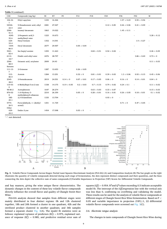 本文研究了昌格甜米酒发酵过程中的微生物群落动态及其风味化合物的演变。采用包括气相色谱 - 质谱法、电子舌和高通量测序在内的综合分析方法,以阐明微生物群落与风味特征之间的关系。结果表明,根霉属和芽孢杆菌属是主要的菌种。斯皮曼相关性分析显示,根霉属和芽孢杆菌属通过酶解、酯化和代谢协同作用显著促进了具有特征性风味化合物(如乙基棕榈酸、苯乙醇和乙基肉豆蔻酸)的形成,为葡萄酒增添了独特的果香、花香和酯香。苹果酸、乳酸和乙酸是影响甜米酒酸度的关键物质,而游离氨基酸则对后味、涩感和浓郁度等口感特征产生不同的影响。这种相互作用揭示了微生物通过调节有机酸 - 氨基酸网络来塑造风味的机制。气味和味道分析表明,在不同的发酵阶段,氮氧化物、有机硫化合物、醛类和酮类、醇类以及酸-鲜味特性等方面存在显著差异,其中芽孢杆菌和根霉菌对气味质量的贡献尤为突出。本研究为改善昌格甜米酒的发酵工艺和质量控制提供了数据支持。