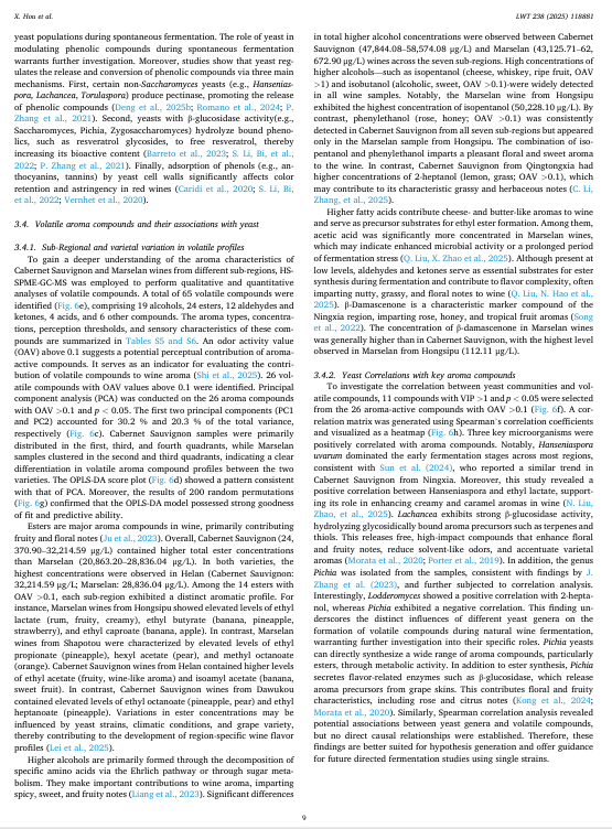 当地的微生物群落对于在自然发酵过程中塑造特定地区的葡萄酒风味起着至关重要的作用。在本研究中,从宁夏贺兰山东部山麓的七个子区域采集了自然发酵的赤霞珠和马斯莱兰葡萄酒样本。我们分析了酵母的演替模式及其与风味化合物的关联,以揭示微生物动态如何推动风味的发展。共分离出 29 种来自 19 个属的酵母物种,其中酿酒酵母属(Saccharomyces cerevisiae)、乌瓦拉氏酵母属(Hanseniaspora uvarum)和星美拉氏酵母属(Starmerella bacilaris)在发酵初期占主导地位。酵母群落结构表现出显著的时间和区域差异,通过高效液相色谱 - 质谱联用技术([PL.C-MS])鉴定出 9 种有机酸和 24 种单体酚类物质。通过顶空固相微萃取 - 气相色谱 - 质谱法(HS-SPME-GC-MS)以及气味活性值(OAV)分析,对 26 种挥发性化合物进行了鉴定。感官分析证实,每个地区都具有独特的香气特征。相关性分析表明,特定的酵母种类与物理化学参数、酚类成分和挥发性化合物之间存在很强的关联。例如,酿酒酵母(Saccharomyces cerevisiae)与酒精和挥发性酸呈正相关,与残糖和总酸度呈负相关。特定的非酿酒酵母可能对地区葡萄酒的特色产生显著影响。本研究为理解当地酵母在地区葡萄酒风味差异中的作用提供了理论基础。