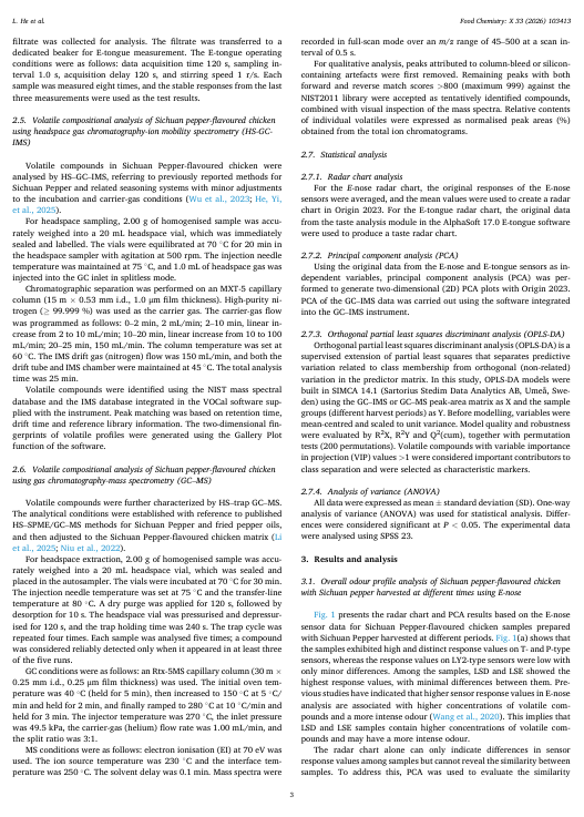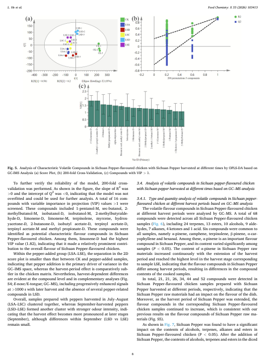 本研究对在五个不同时期(7 月至 9 月)收获的花椒进行了比较,以用于制作四川花椒味鸡肉。通过电子鼻和电子舌分析,将对照组与花椒处理组样本区分开来,并进一步区分了早期收获(7 月至 8 月)与晚期收获(9 月)的差异。9 月收获的花椒具有更强的气味、更高的鲜味和酸度,以及更低的苦味。气相色谱 - 质谱指纹图显示了挥发物组成的收获依赖性变化,而 OPLS-DA(VIP > 1)则突出了柠檬烯-D/M(VIP 最高)、萜品醇、肉桂烯、仲丁醇、异丁基乙酸-D 和萜基乙酸-D/M 作为关键标志物。气相色谱 - 质谱检测到 68 种挥发性物质;OPLS-DA 标志物(VIP > 1)包括 3-戊烯-2-醇(VIP 最高)、蒎烯、柠檬烯、胡椒烯、柠檬烯酸乙酯和桉叶醇,而α-蒎烯随收获期的变化显著。总体而言,后期收获增加了萜烯/酯的含量,并最有效地增强了四川花椒味鸡肉的特色风味。