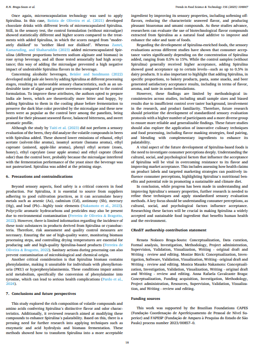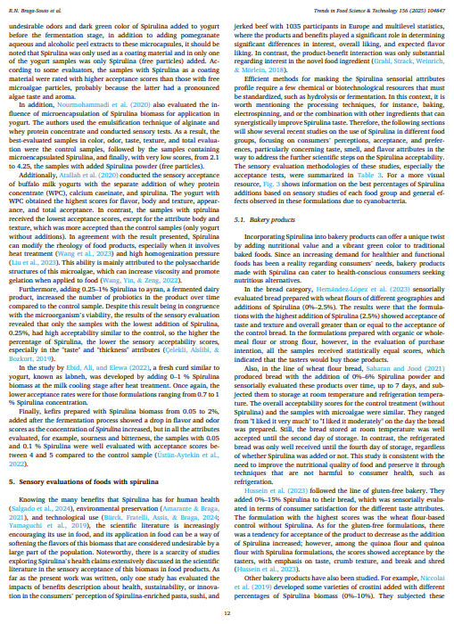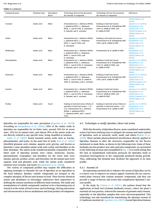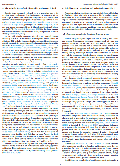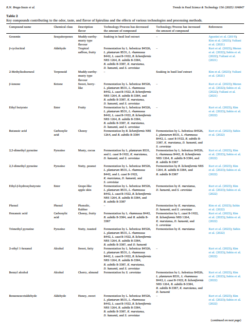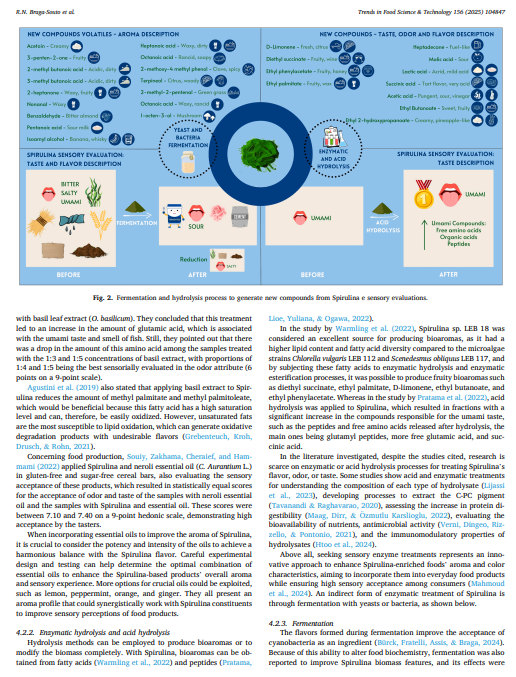 背景:诸如螺旋藻(利姆诺螺旋藻)之类的蓝藻通过可持续的水培方式利用自然资源生产蛋白质含量高的替代品,可用于食品加工。虽然螺旋藻在质地、营养质量和生物效应方面有所改善,但其风味却是一个关键挑战,直接影响着消费者的接受度。研究范围和方法:因此,本研究旨在回顾有关导致螺旋藻风味、味道和气味的挥发性化合物和氨基酸的科学文献,并讨论即将采用的方法,例如酶解、酸水解、发酵、微胶囊化以及与精油混合以改变其口味特征等,例如基于实验设计。此外,该研究还回顾了当前富含螺旋藻的食品,以了解消费者的看法,并确定推进创新产品以提高消费者接受度和购买意愿的机会。主要发现与结论:针对改变螺旋藻风味的多种技术进行了研究,这些技术通过减少导致不良气味的化合物,并生成生物香气和乌米类化合物,取得了令人鼓舞的成果。然而,还需要进行更多研究,以确定经过处理的螺旋藻在食品基质中的应用是否适合消费者感官评估。在添加到螺旋藻中后,烘焙产品和意大利面在可接受性方面表现突出。同时,食品的感官研究需要采用标准化的方案,招募更多的参与者参与接受度研究,并通过确保负责研究的研究人员不参与感官评估来消除偏差。此外,还需要研究一个方面,即螺旋藻食品标签上的健康声明是否能积极影响消费者的感知,尽管其具有独特的风味。