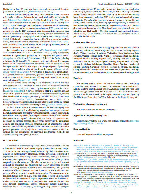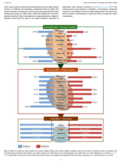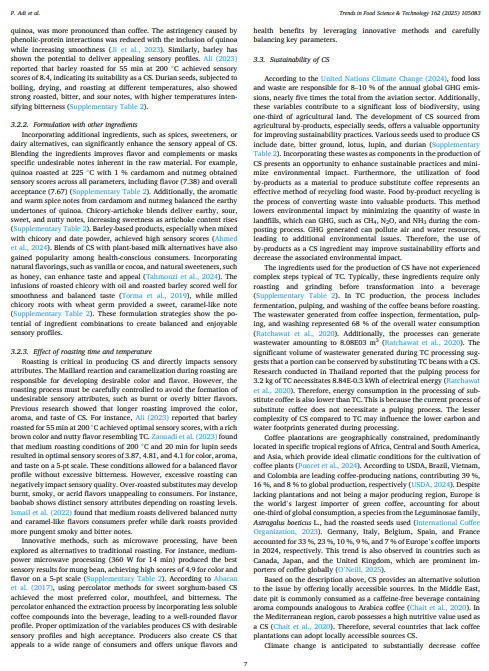 背景:消费者对咖啡的偏好受价格、可持续性和健康因素的综合影响,这些因素共同塑造了购买决策。在此背景下,以往的研究侧重于使用对环境影响最小的成分来开发食品替代品,以促进可持续发展目标(SDGs)。然而,由于全球产量下降(主要由气候变化驱动),不断增长的咖啡需求未能得到满足。这种情况促使开发咖啡替代品(CS)以取代传统咖啡(TC)。范围和方法:本综述旨在确定咖啡替代品开发的关键挑战。此外,还概述了缓解咖啡替代品开发问题的策略以及未来的研究方向,以提高咖啡替代品的整体质量。关键发现和结论:咖啡替代品在健康方面具有巨大潜力,包括个性化咖啡以提高市场接受度。替代品面临诸多障碍,比如难以复制咖啡复杂传感器的特性、安全问题以及可持续性考量。研究结果表明,未来的研究方向可以利用人工智能(AI)和非热新兴技术,如大气冷等离子体(ACP)、超声波(US)、脉冲电场(PEF)、高压处理(HPP)和脉冲光(PL),来改善咖啡替代品的风味、安全性和可持续性。