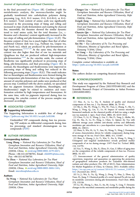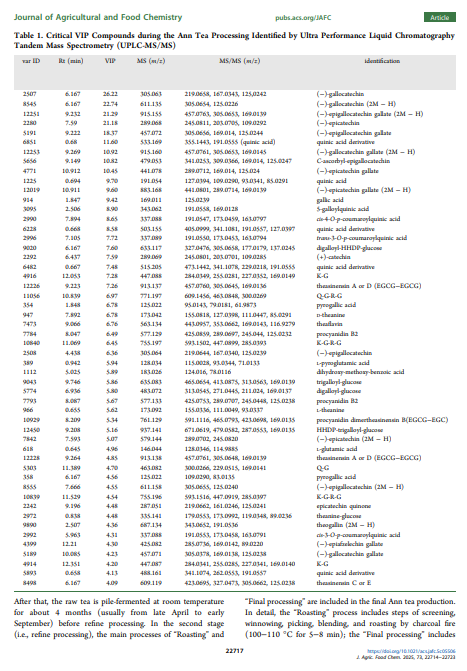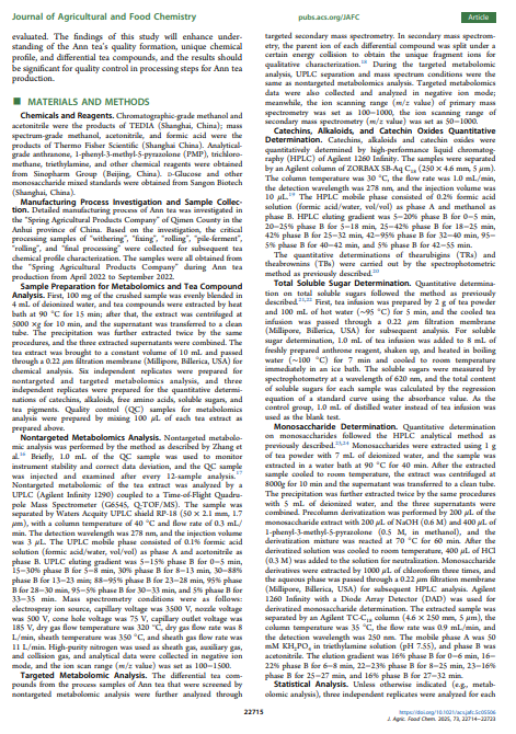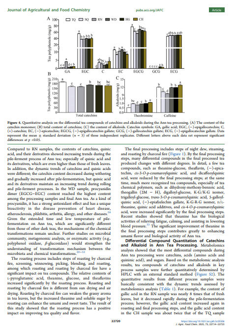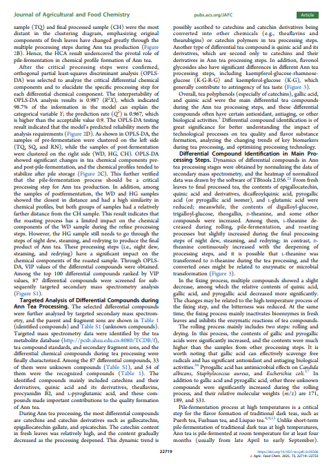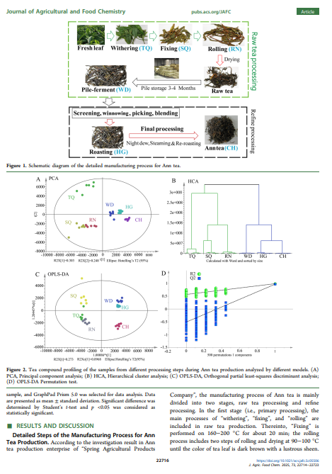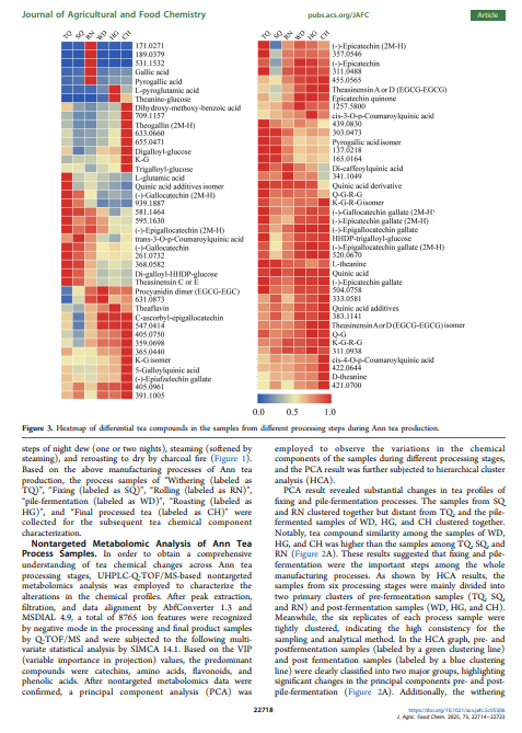 安茶是产自安徽省的一种传统中国黑茶,因其口感宜人且具有保健功效而深受消费者喜爱。在此,对其详细的制造流程进行了研究,并对关键加工步骤的样品进行了化学特性分析。在制造过程中,约 15% 的儿茶素和单糖显著减少,并转化为聚合物,如茶氨酸-葡萄糖、原花青素二聚体和茶氨酸辛素。茶黄素主要在固定、堆发酵和最终加工步骤中产生;茶红素和茶褐素在固定和揉捻过程中略有改善,但并非来自堆发酵过程,这与其他黑茶有所不同。代谢组学分析表明,堆发酵在化学转化中起着重要作用,主成分分析显示堆发酵前后有显著变化。与高温堆发酵的黑茶(如普洱茶)相比,安茶加工过程中儿茶素的减少相对较低,这可能归因于在室温下的堆发酵过程。
