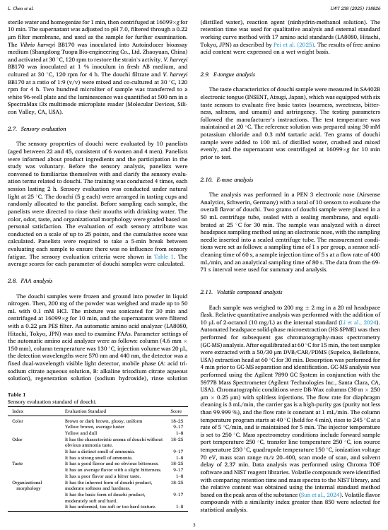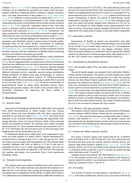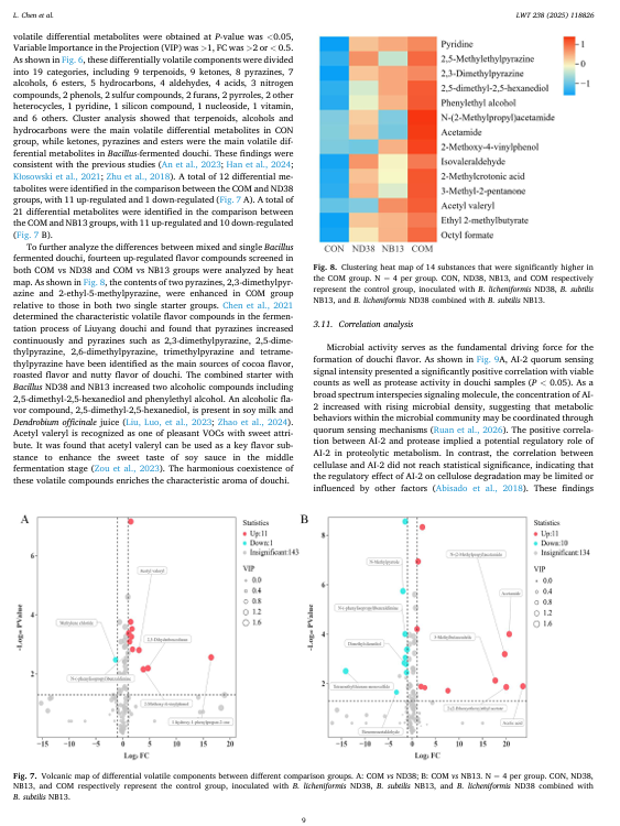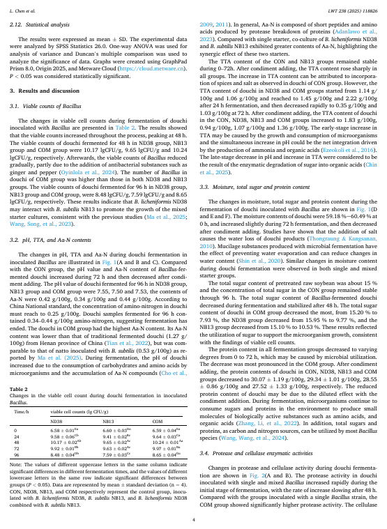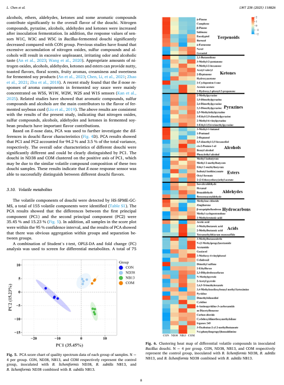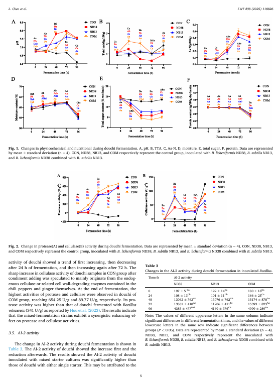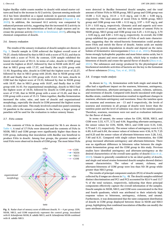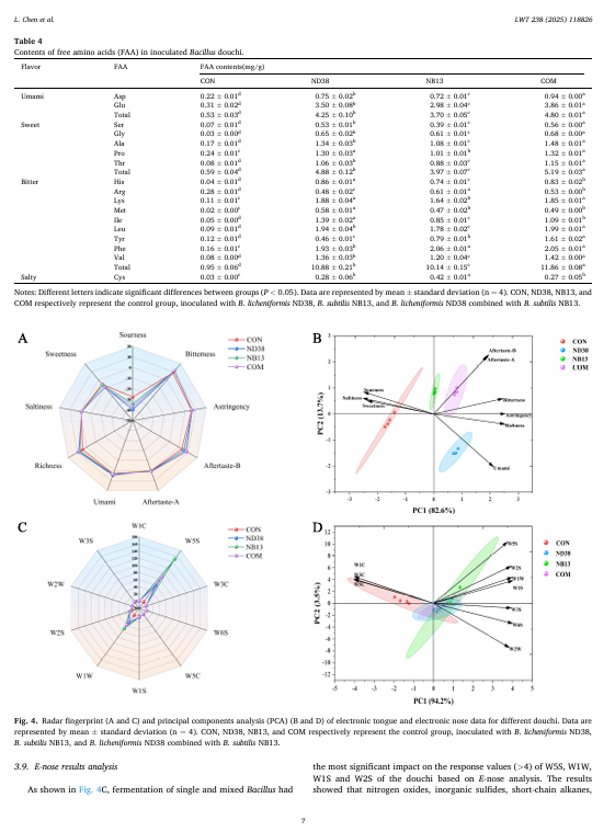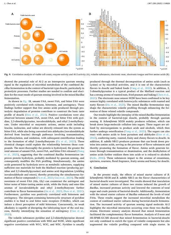 本研究旨在探究产纤维素酶的枯草芽孢杆菌 ND38 和产蛋白酶的枯草芽孢杆菌 NB13 的混合发酵剂对泡菜风味特性的影响。与单一发酵剂相比,混合发酵剂提高了泡菜的总可滴定酸度、氨基酸氮含量和蛋白酶活性,同时降低了总糖和粗蛋白含量。在含有联合枯草芽孢杆菌发酵剂的泡菜中,观察到更高的活菌数量和自动诱导分子(Al-2)的活性。此外,混合发酵的泡菜中总游离氨基酸(FAA)含量比 ND38 单一菌株发酵和 NB13 单一菌株发酵分别高出 9.02%和 21.34%。电子感官分析表明,混合枯草芽孢杆菌发酵赋予了泡菜独特的风味组合。泡菜表面的固态物质。相微萃取气相色谱-质谱(HS-SPME-GC-MS)分析表明,混合起始菌株结合了每个单一菌株的互补挥发性特征,赋予了独特的坚果、烤焦、奶油和花香等芳香风味。特别是,诸如吡嗪类、醇类、醛类和酯类等挥发性化合物的含量有所增加。这些发现表明,混合的芽孢杆菌起始菌株能够增加游离氨基酸的生成并改善风味的形成,这可能是通过微生物相互作用实现的,显示了它们在豆豉生产中的潜在应用价值。