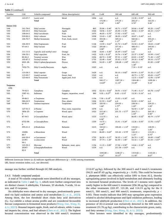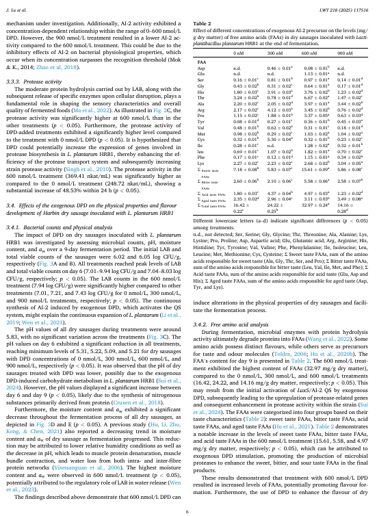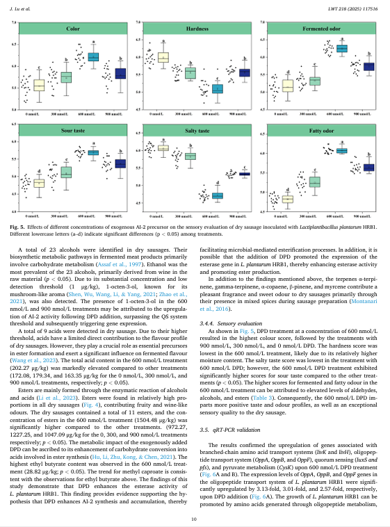 本研究旨在探究 4,5-二羟基-2,3-戊二酮(DPD;0、300、600 和 900 纳摩尔/升)——作为 LuxS/Al-2 信号感知系统的关键前体——对乳植酸杆菌 HRBl 在体外和干香肠模型中风味形成的影响。首先,从 18 种乳酸菌菌株中选出了 L. 植酸杆菌 HRBl,因其具有出色的 Al-2 和蛋白酶活性。在体外实验中,DPD 显著提高了 Al-2 的活性和 HRBl 的蛋白酶活性。在发酵的干香肠中,与其他处理相比,600 纳摩尔/升 DPD 处理组的游离氨基酸含量显著更高。值得注意的是,用 600 纳摩尔/升 DPD 处理的干香肠中醛类(558.50 微克/千克)、酮类(192.41 皮克/千克)、醇类(1175.56 微克/千克)、酸类(202.27 微克/千克)、酯类(1504.48 微克/千克)和萜类(1319.82 微克/千克)的含量最高。感官分析表明,用 600 纳摩尔/升 DPD 处理的干香肠具有最显著的发酵和脂肪气味。这些结果表明,600 纳摩尔/升 DPD 促进了 L. 植酸杆菌 HRB1 的风味形成。这项研究为利用 LuxS/AI.2 提供了理论基础。该技术旨在优化微生物发酵过程,并提升发酵食品的品质,尤其是改善其风味。