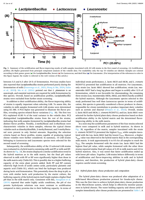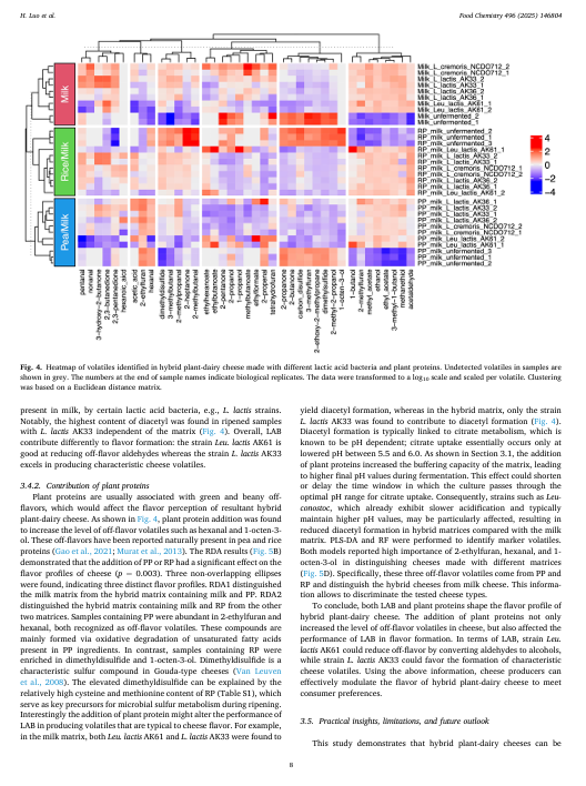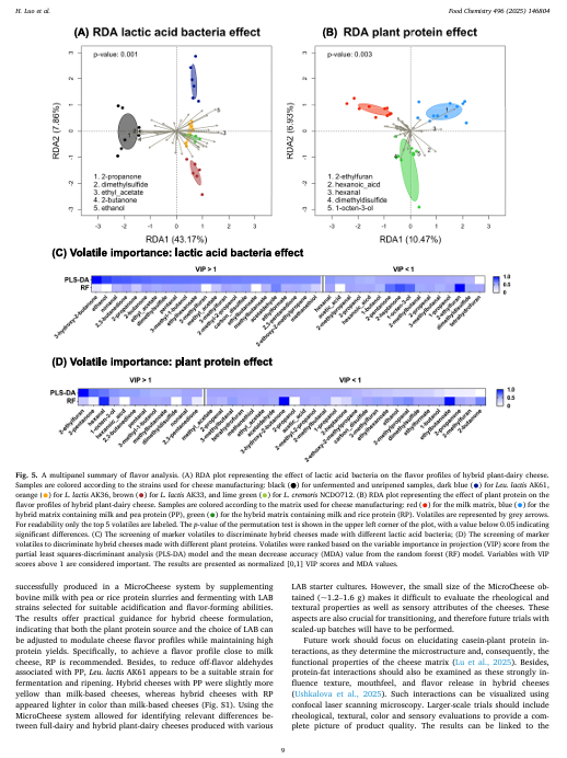 在努力提升食品供应链可持续性的过程中,植物基奶酪替代品的市场正在不断扩大。然而,感官缺陷,尤其是与风味相关的缺陷,仍然是一个挑战。在此,我们开发了一种兼具风味与可持续性的混合植物-乳制品奶酪。在筛选了 44 种用于酸化和改善风味能力的乳酸菌(LAB)菌株后,选择了其中的四种进行在新开发的混合 MicroCheese 系统中的进一步测试。混合奶酪可以通过在牛乳中添加 18%(质量分数)的稻米或豌豆蛋白浆(比例为 9:1)来实现。气相色谱-质谱分析表明,发酵过程能够减少由植物蛋白产生的不良风味,同时还能产生理想的奶酪风味挥发物。机器学习为了解乳酸菌和植物蛋白如何塑造混合奶酪的风味提供了数据驱动的理解,识别了标志性的挥发性物质,并能够区分这些奶酪类型。